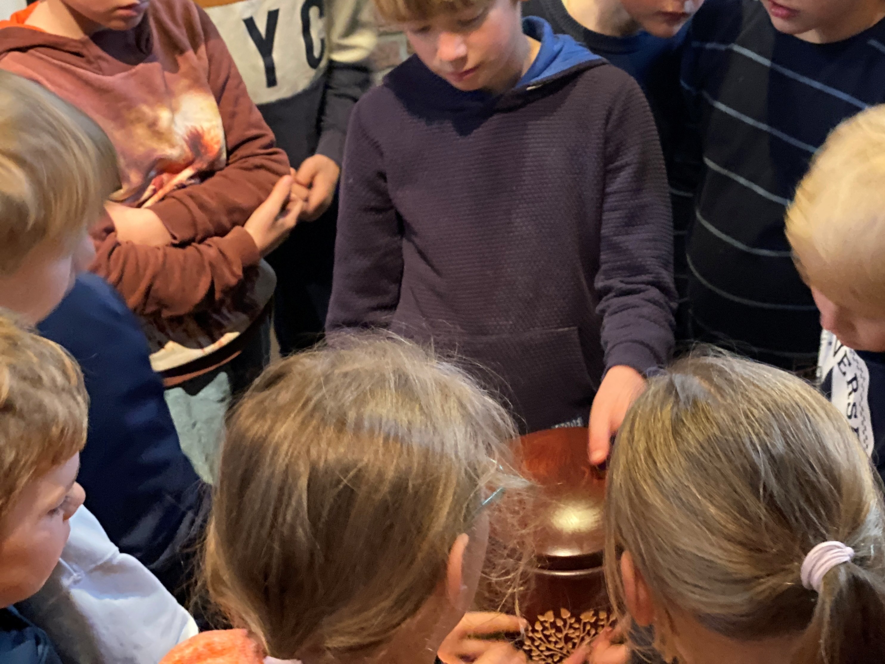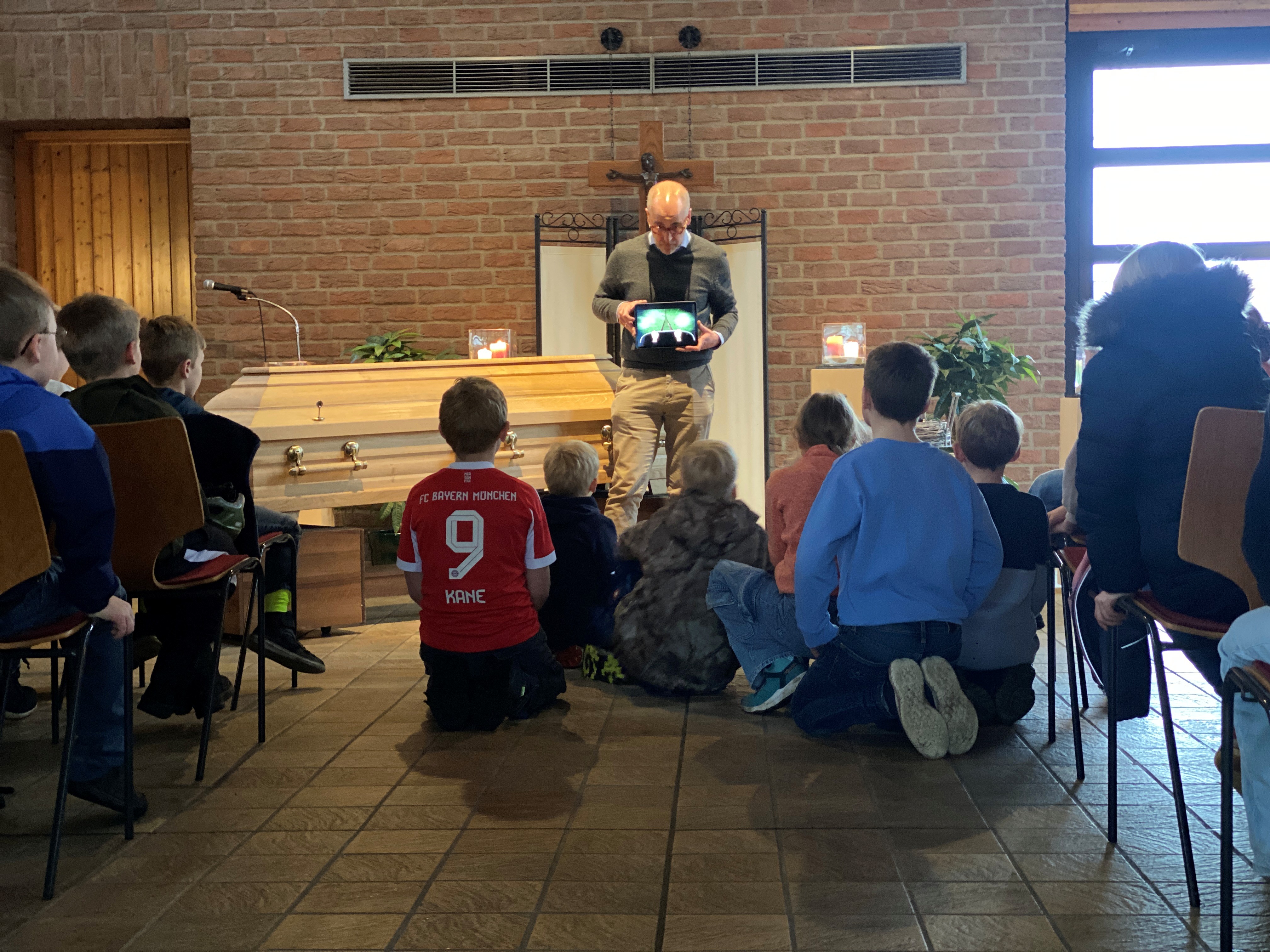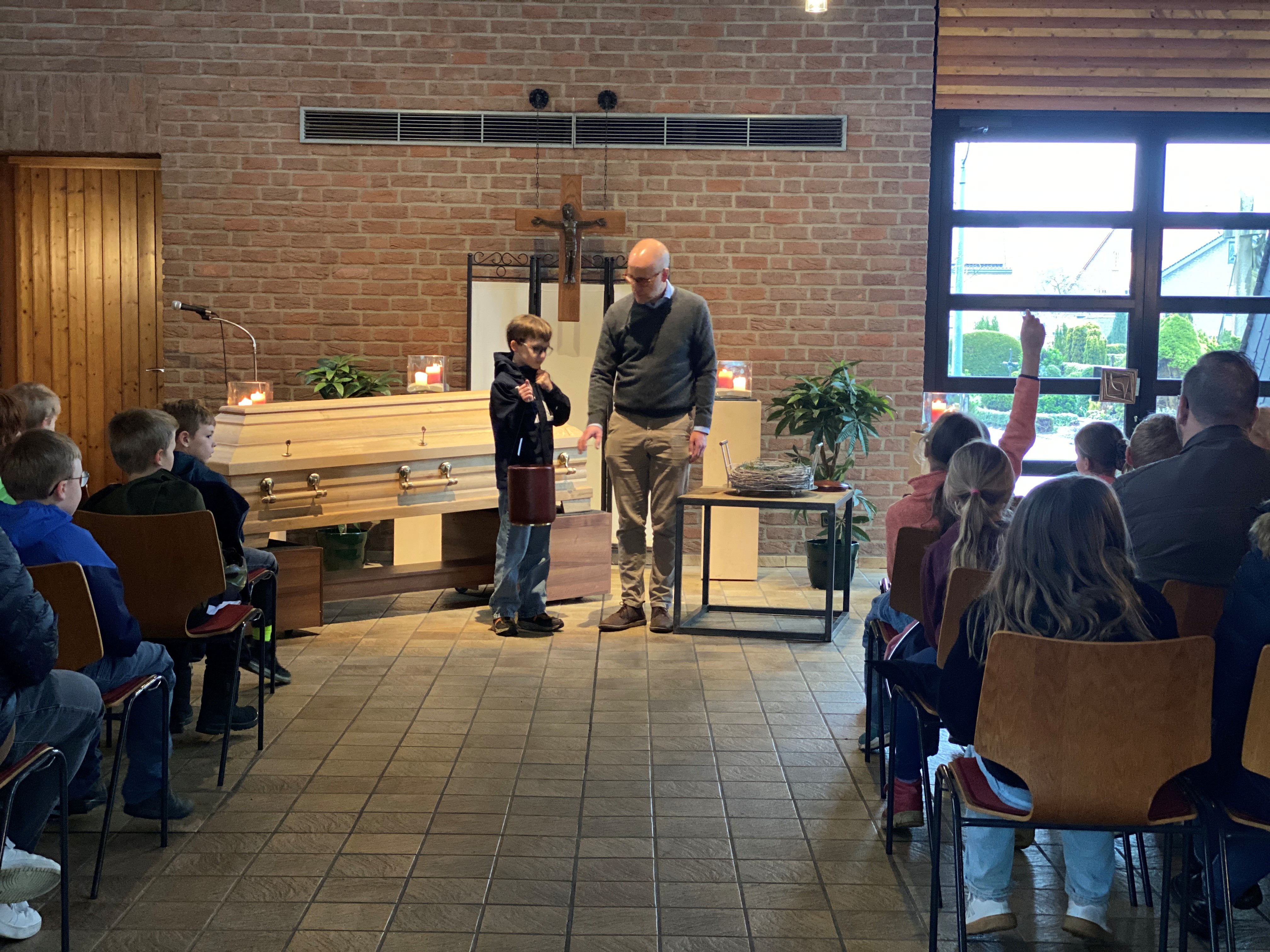 Die Kinder durften sich auch eine Urne und einen Sarg anschauen. In den Verabschiedungsräumen bekamen sie Eindrücke davon, wie Würde und Respekt im Abschiednehmen getragen werden.