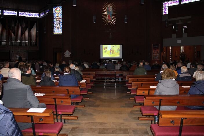 Große wie kleine Gemeindemitglieder folgten gespannt den Erzählungen zu den Bildern und tauchten so gemeinsam in die biblische Botschaft ein.